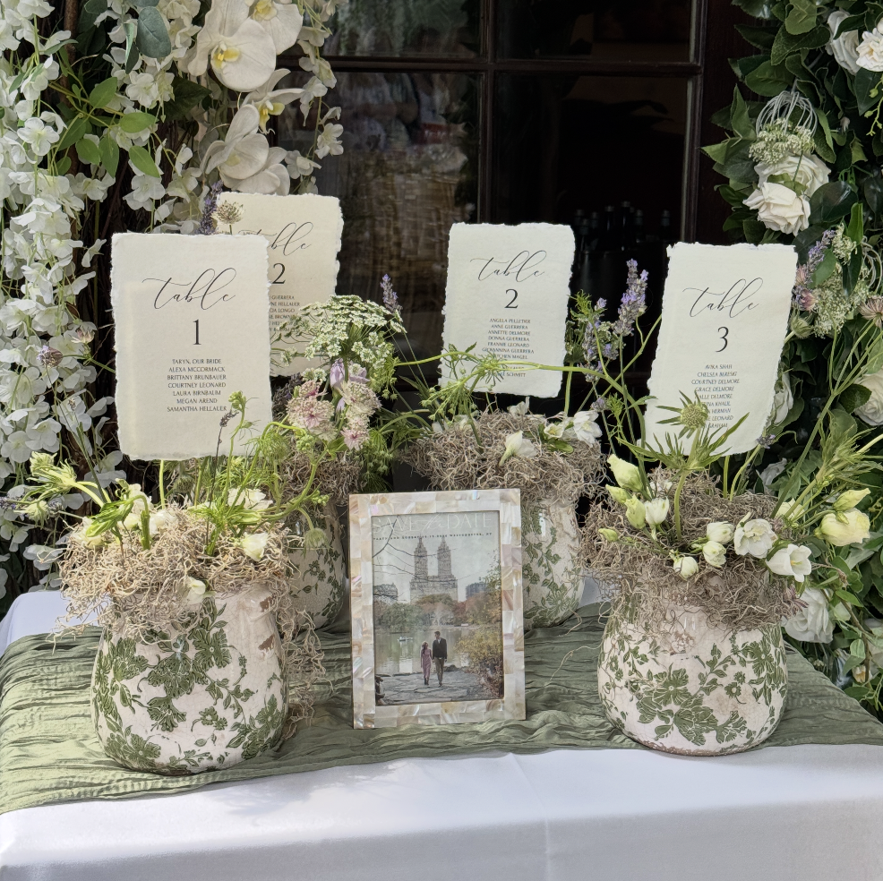 SEATING CARDS IN CLEAR FLUTED VASES WITH GREEN MOSS AND WILD FLOWERS.